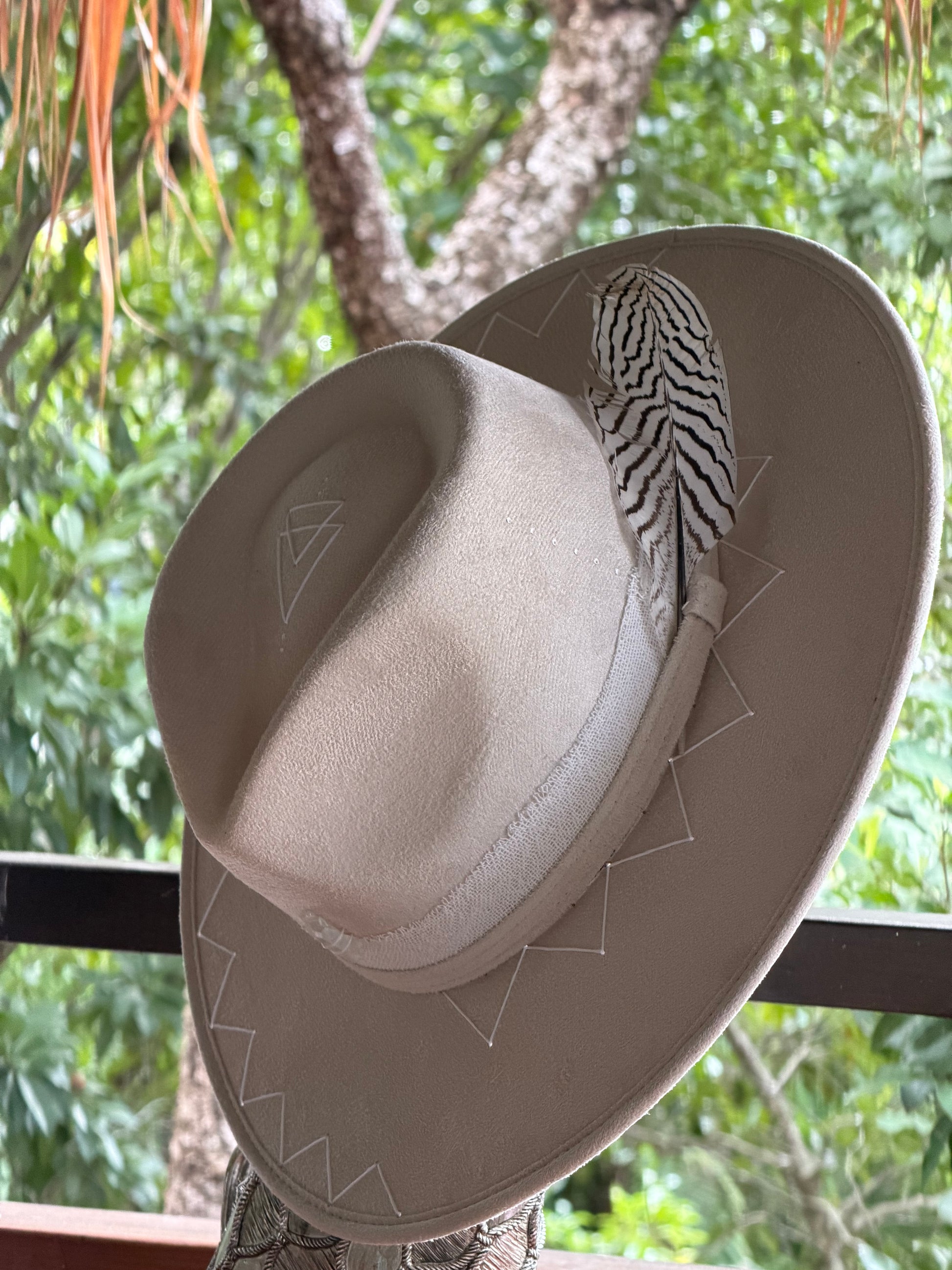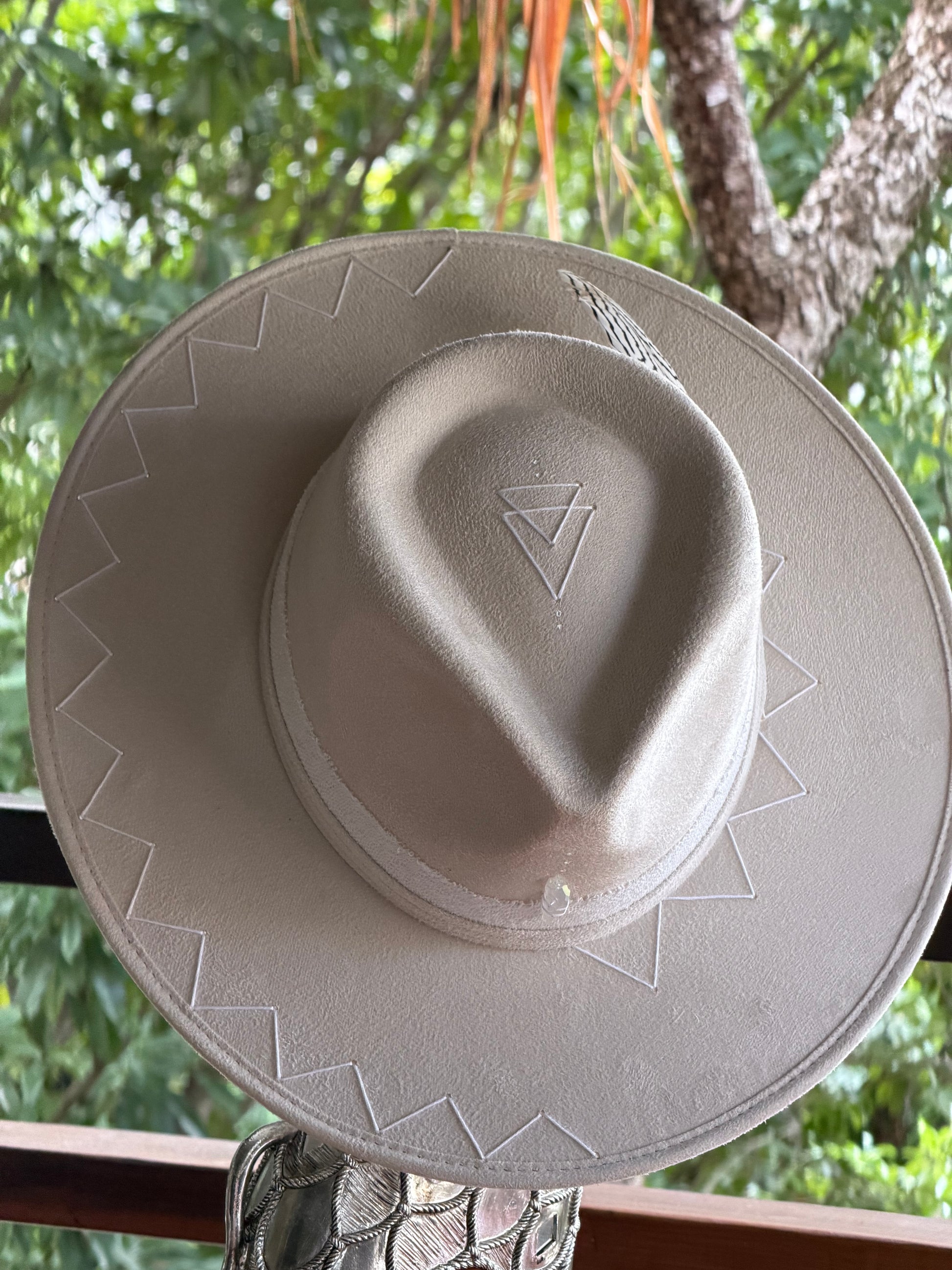 An alchemical piece crafted through contrast. Fire leaves its mark above and below the brim, copper details carry warmth, and a black crystal protects and grounds. A refined expression of elemental craftsmanship.