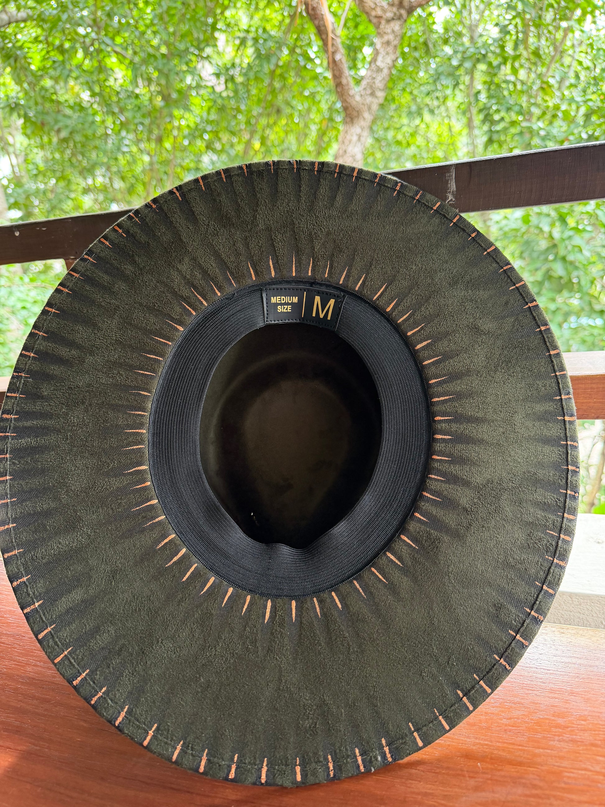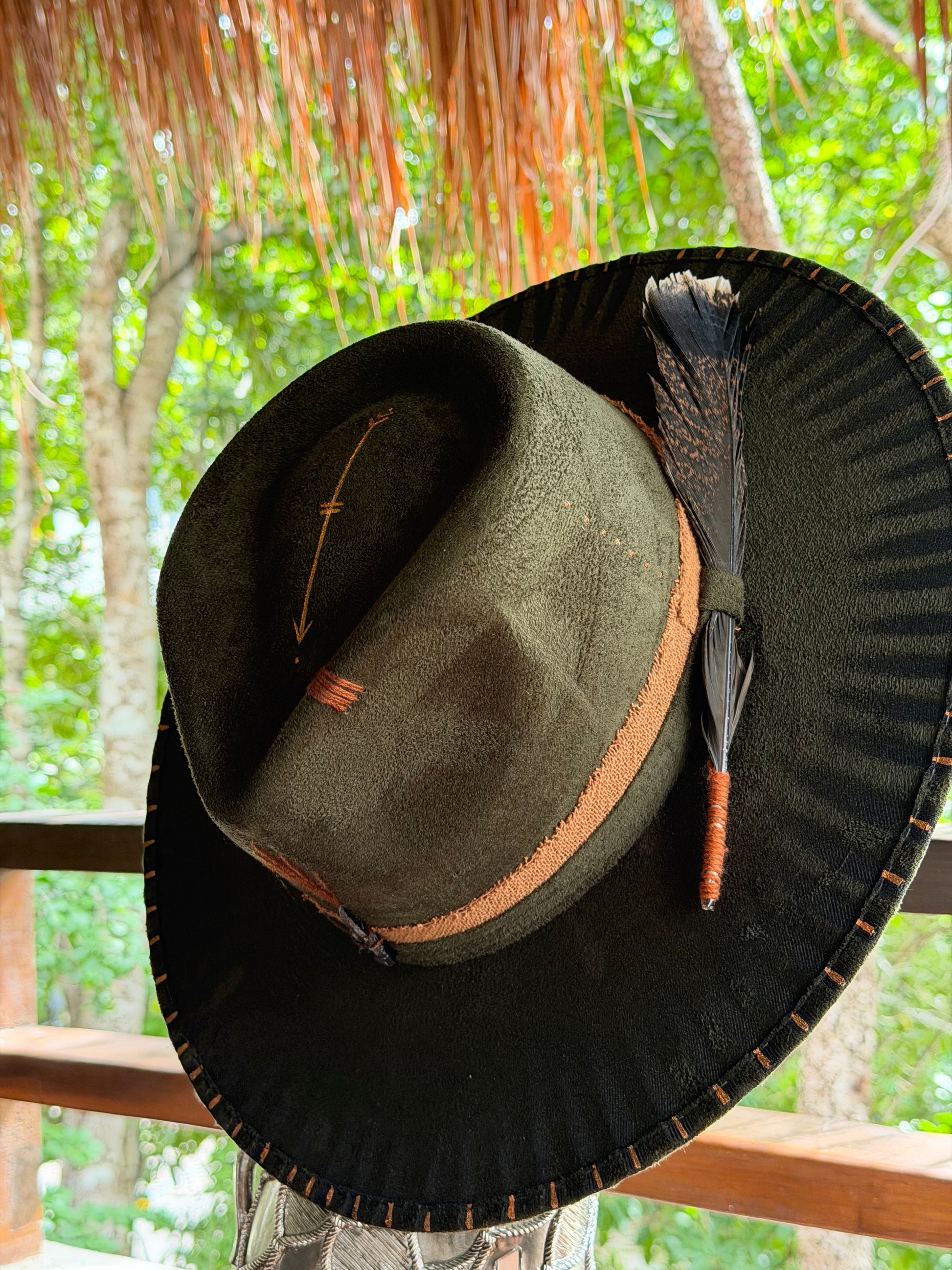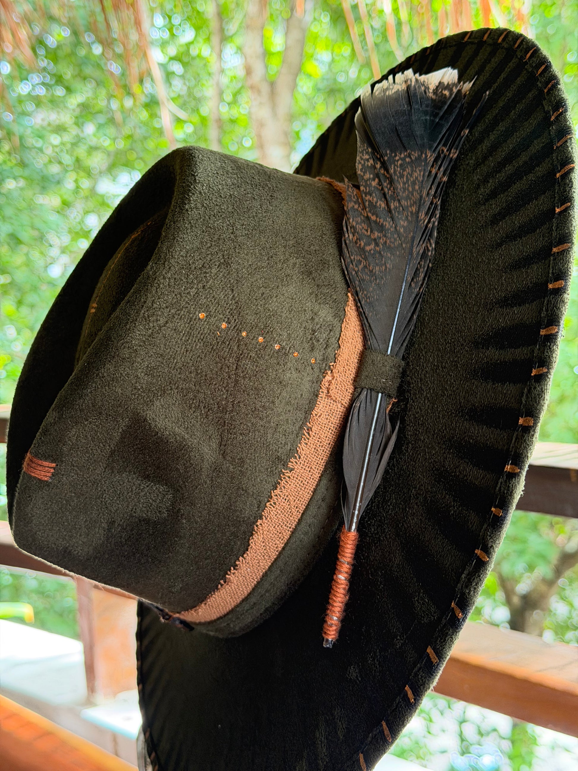 A dark green felt hat with burned edges, copper stitching, black crystal, and a brown feather—handcrafted in the Tulum jungle.