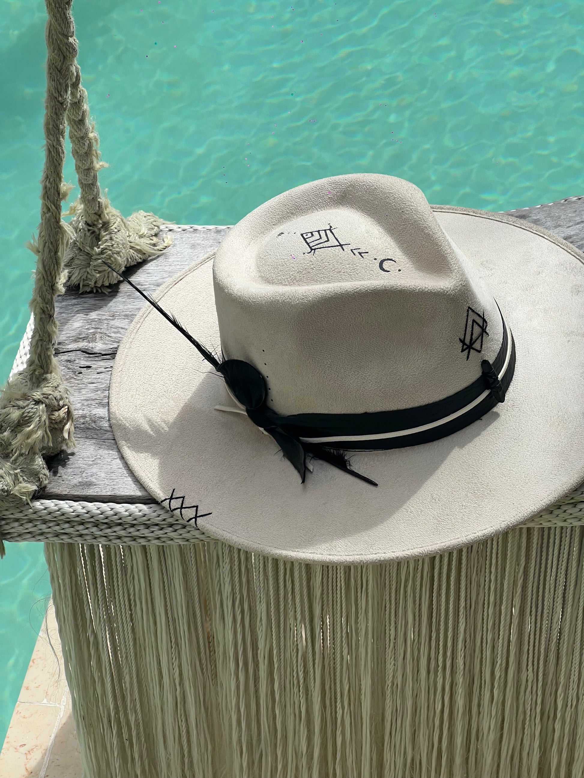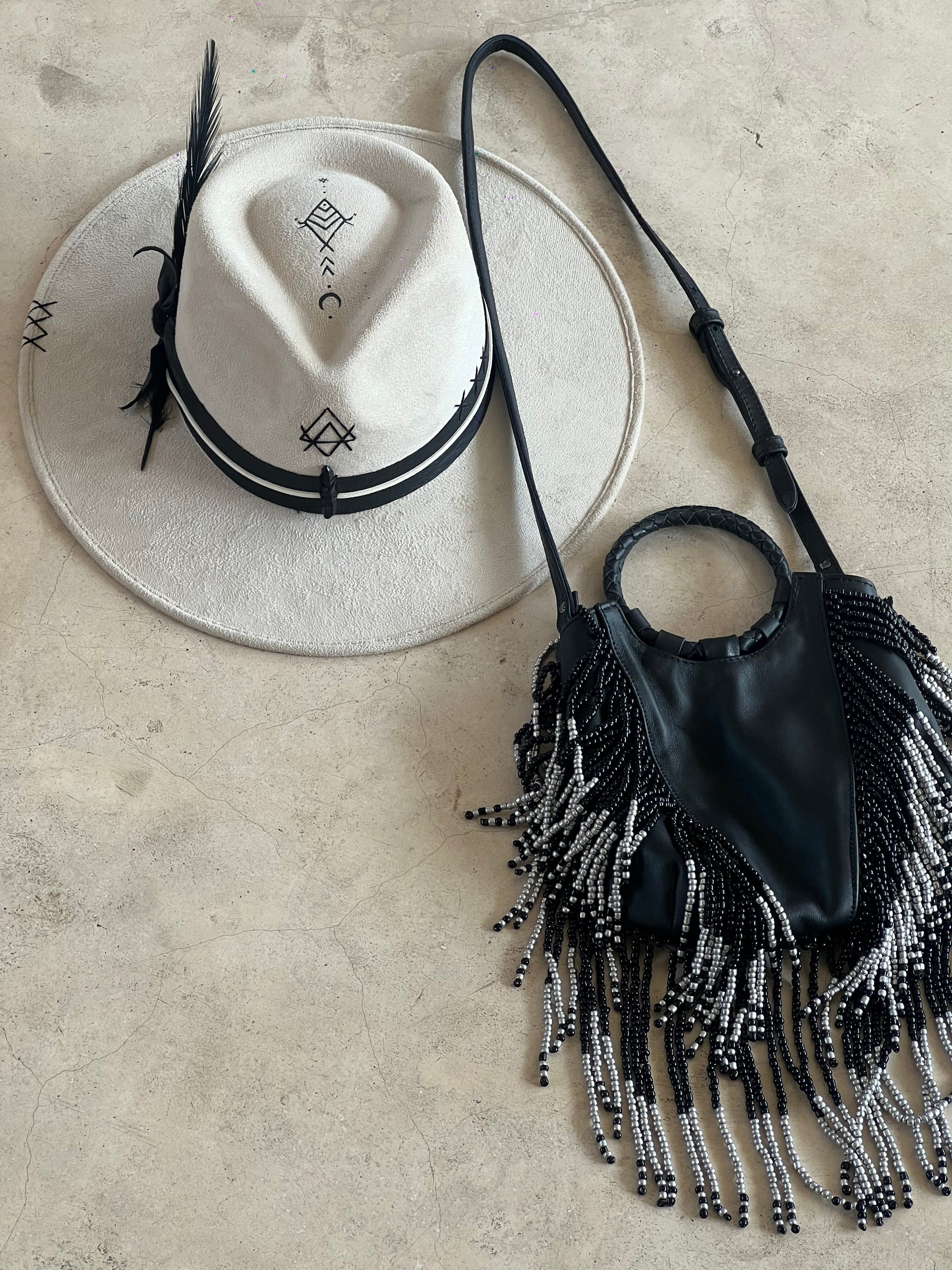 The Nomad white fedora blends refined craftsmanship with spiritual aesthetics. This distinguished hat features a clean white base complemented by intricate black spiritual iconography that commands attention. Each piece is enhanced with a genuine black onyx stone—a mineral revered for its grounding properties—and a carefully positioned feather that evokes wanderlust and ethereal connection. The combination of these elements creates a versatile accessory suitable for both everyday wear and ceremonial occasions. Ideal for individuals who appreciate headwear that reflects deeper meaning alongside contemporary design sensibilities.